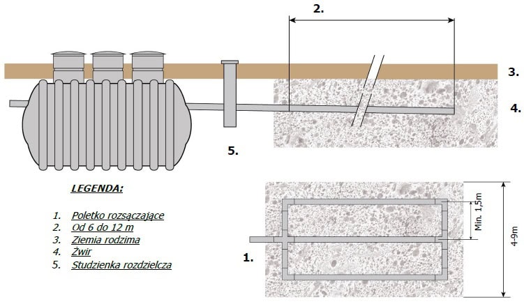- Rur perforowanych, które rozprowadzają ścieki równomiernie po całej powierzchni.