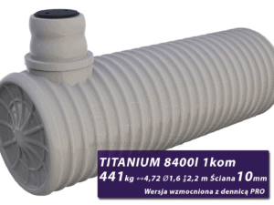 Wzmocniony zbiornik podziemny, jednokomorowy z dennicą PRO o pojemności 8400l, przeznaczony do magazynowania ścieków w budownictwie jednorodzinnym. Jako zbiornik na szambo świetnie sprawdzi się dla 3-4 osób.